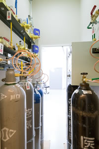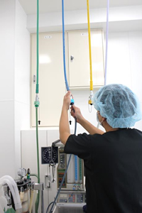 医療ガス集中配管システム。手術室では医療ガス麻酔や静脈麻酔を常時使用できる体制です。